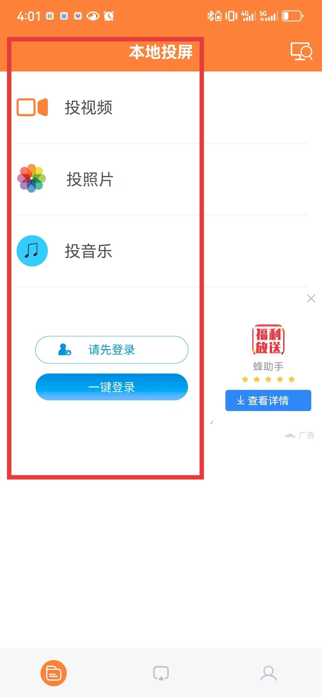 1、本地投屏頁面這里有投視頻、投照片、投音樂三個選項,分別對應投屏視頻、照片和音樂內容,點擊相應選項可選擇手機本地的視頻、照片或音樂文件進行投屏。