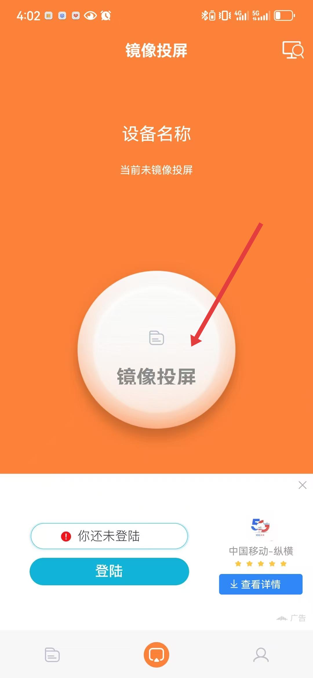 2、在軟件中找到鏡像投屏功能入口進入,界面會顯示當前未進行鏡像投屏狀態,點擊鏡像投屏按鈕手機屏幕內容將實時同步鏡像到電視上,方便進行游戲、演示等操作。