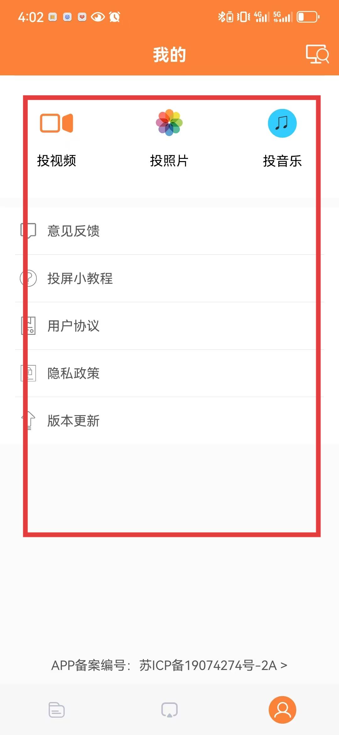 3、個人中心頁面這里除了能找到投視頻、投照片、投音樂功能入口外,還有意見反饋、投屏小教程、用戶協議、隱私政策、版本更新等選項。