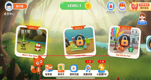 1、主界面按單元劃分學習內容,提供多類學習工具,搭配輔助功能,界面風格童趣化,適配兒童進行英語啟蒙學習。