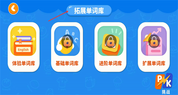 2、拓展單詞庫頁分四類單詞庫,采用分級解鎖模式,逐步提升學習難度,可適配不同階段的兒童詞匯學習需求。
