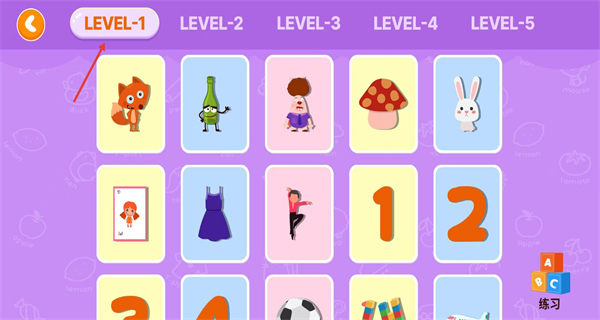 3、分級練習頁按等級劃分練習內容,以卡通圖文卡片展示詞匯,通過互動練習強化記憶,助力掌握對應詞匯。