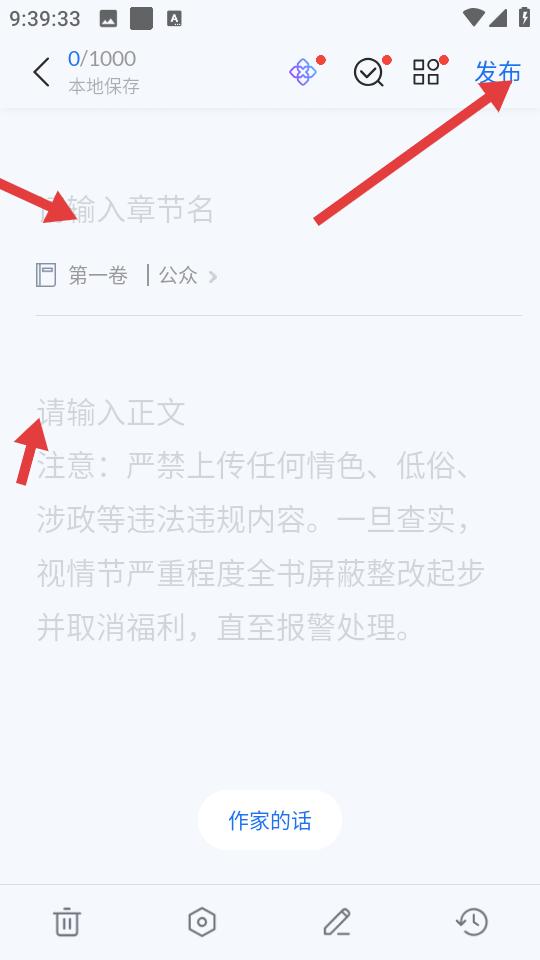 3、在編輯頁填好章節名、寫好正文,確認內容合規后,點擊右上角發布按鈕,即可將作品推送至選定平臺,完成發布流程,讓創作走向讀者。