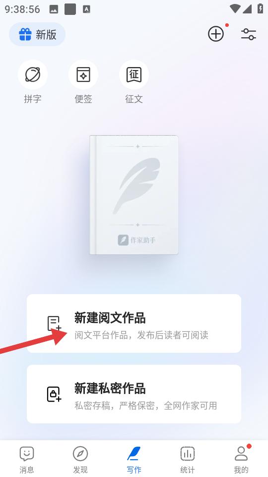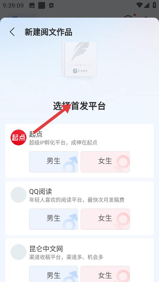 1、進入寫作界面點擊新建閱文作品,跳轉至平臺選擇頁,可依據作品風格選起點、QQ閱讀等首發平臺,還能區分男女頻道。