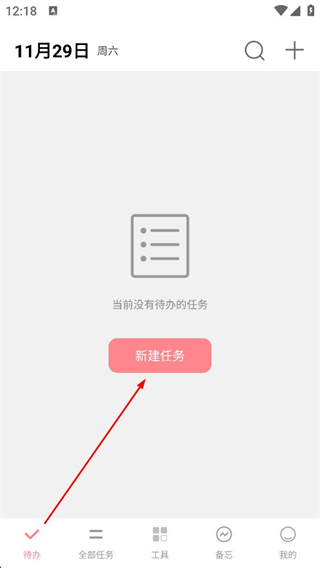 1、打開明天計劃軟件進入待辦頁面,查看當前無待辦任務的提示,點擊新建任務按鈕,展開任務類型選擇菜單。