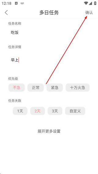 3、在多日任務頁面輸入任務名稱為吃飯,填寫任務詳情為早上,選擇優先級為不急,設置任務天數為2天然后點擊確認