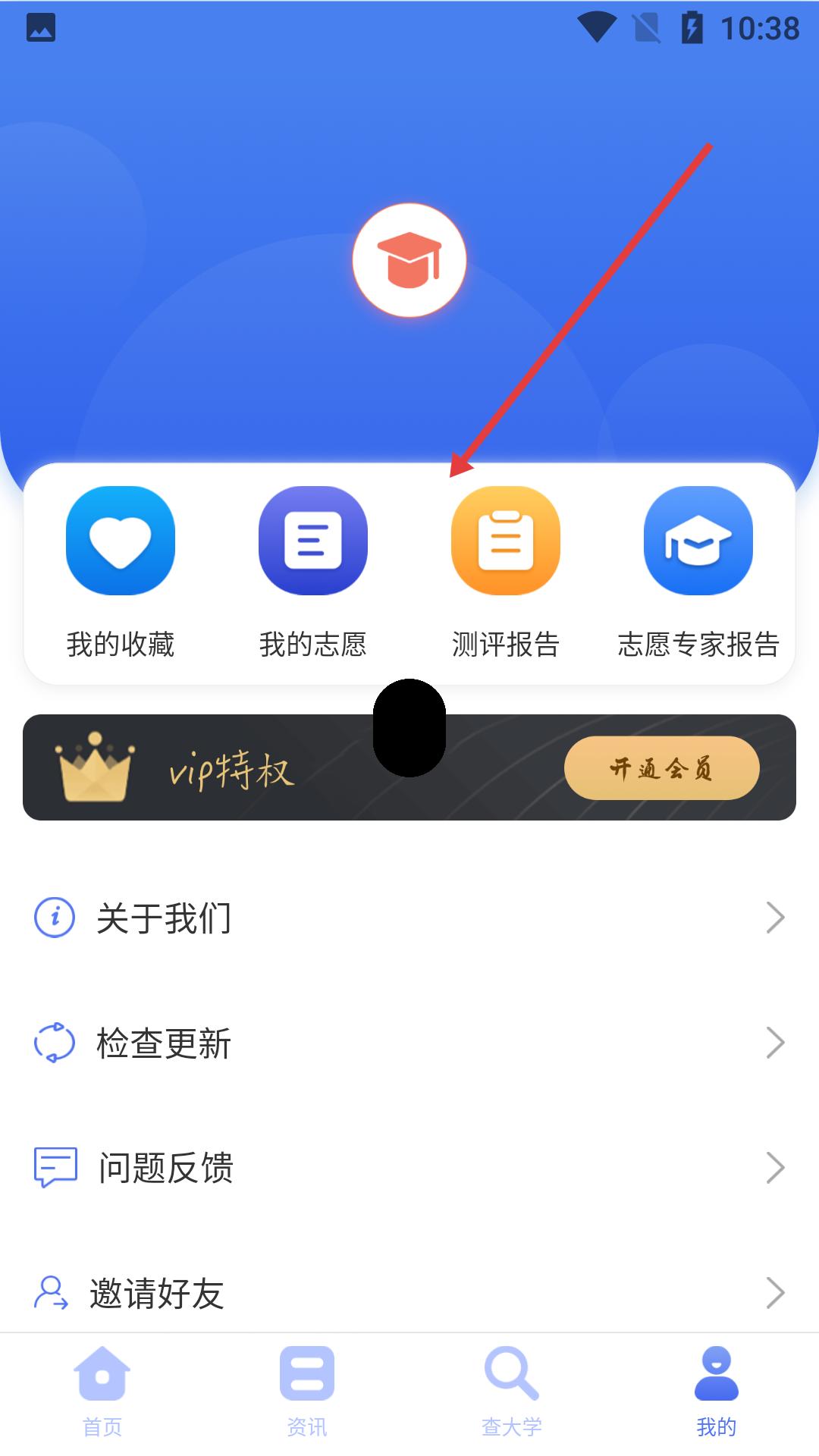 3、進入我的頁面能看到我的收藏,我的志愿,測評報告等功能選項,點擊測評報告,可查看自己的測評相關內容,為志愿填報提供參考。