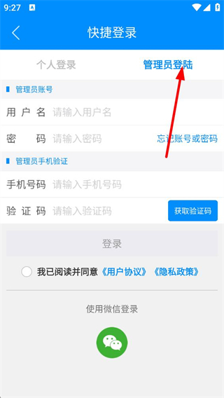 4、若為管理員,可選擇管理員登錄,輸入用戶名和密碼,或通過管理員手機驗證輸入手機號碼和驗證碼,勾選同意協議后完成登錄,進行管理操作。