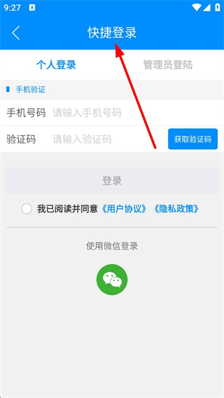 3、進行快捷登錄時,選擇個人登錄,輸入手機號碼和驗證碼,勾選同意用戶協議和隱私政策后點擊登錄,也可使用微信登錄方式。
