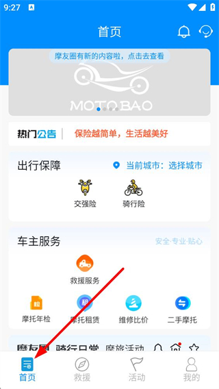 1、進入摩托寶首頁,可查看熱門公告,使用出行保障中的交強險、騎行險服務,還能享受車主服務里的救援、摩托年檢等功能,開啟摩托相關服務體驗。