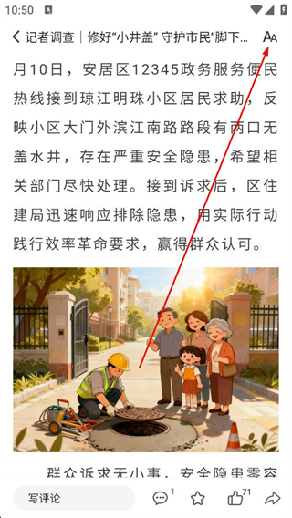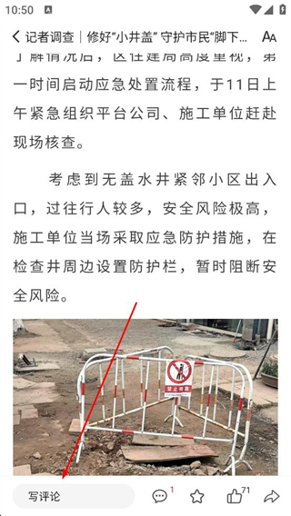 4、調整字體后繼續瀏覽資訊,查看施工單位采取的應急防護措施內容,點擊寫評論框可輸入個人看法進行互動。