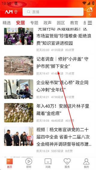 1、打開安居融媒app,進入首頁瀏覽精選板塊的資訊,選擇修好小井蓋的資訊,點擊進入該資訊的詳情頁面。