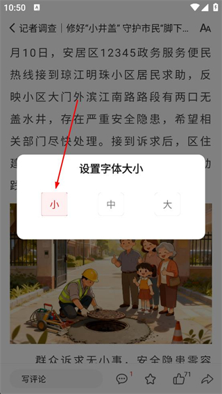 3、在資訊詳情頁面點擊字體設置按鈕,選擇小字號選項,調整資訊內容的字體大小以適配閱讀習慣。