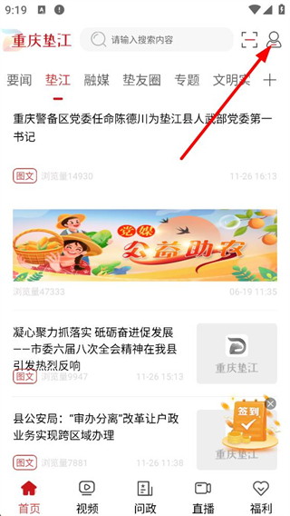 1、進入重慶墊江首頁可瀏覽要聞墊江等板塊資訊,點擊右上角個人圖標,可進入個人中心頁面,查看各類個人相關功能。