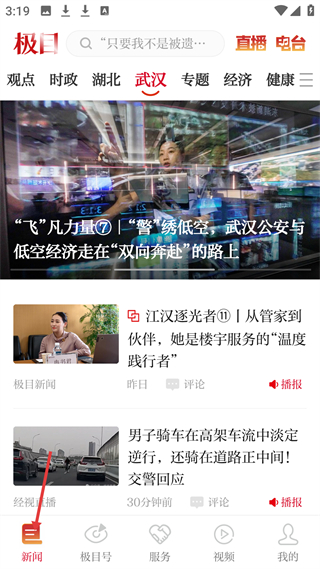 1、新聞板塊武漢分類,展示武漢公安低空經濟、樓宇服務踐行者等本地新聞,提供播報功能,方便用戶了解武漢時政社會動態。