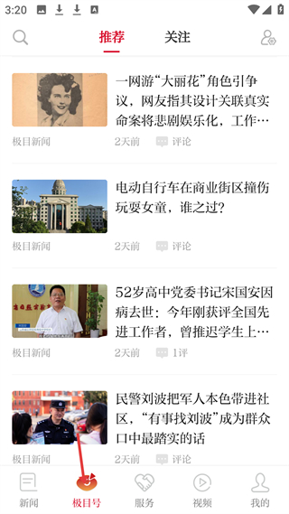2、極目號板塊推薦網游角色爭議、電動自行車撞傷女童等新聞,用戶可關注賬號獲取感興趣內容。