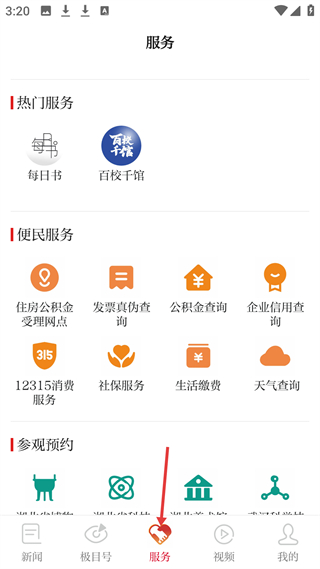 3、服務板塊有每日書等熱門服務,便民服務含住房公積金、發票查詢等,還有參觀預約功能,助力用戶辦理各類事務。