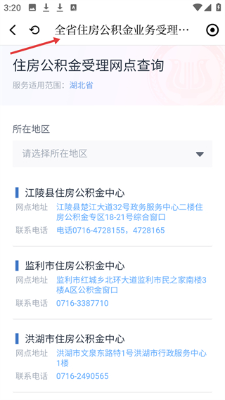 4、住房公積金查詢板塊可查湖北省內受理網點,展示江陵、監利等地公積金中心地址電話,方便用戶辦理公積金業務。