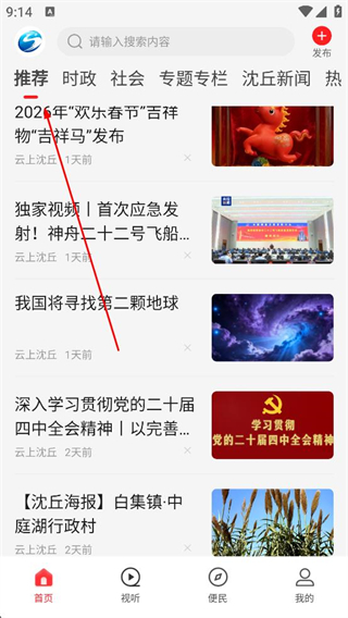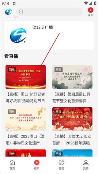 1、打開云上沈丘app進入首頁,瀏覽推薦的資訊內容,點擊底部導航欄的視聽選項,進入視聽頁面,準備查看直播相關內容。