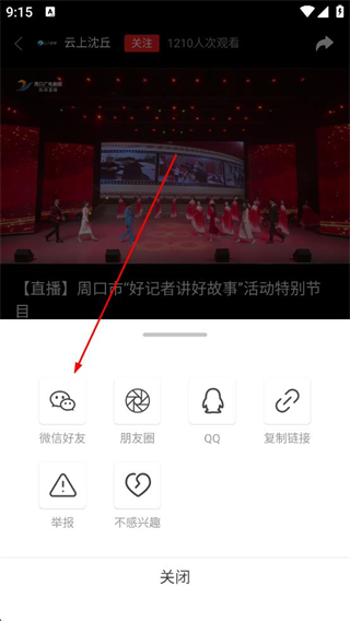 4、點擊頁面中的分享按鈕彈出微信好友朋友圈等分享渠道,選擇對應的渠道將直播內容分享給朋友。