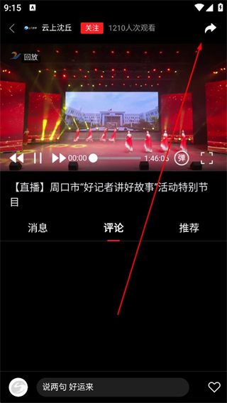 3、進入直播播放頁面可觀看節目內容,切換到評論標簽頁,在輸入框填寫內容參與互動,也能點擊分享按鈕。