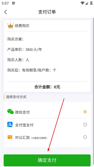4、進入支付訂單頁面查看購買方案及合計金額,選擇微信支付支付寶支付等方式,確認信息無誤后點擊確定支付按鈕完成支付流程。