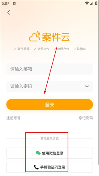 1、進入案件云登錄頁面,可選擇輸入郵箱和密碼點擊登錄,也能選其他登錄方式,比如使用微信登錄或手機驗證碼登錄。