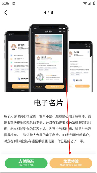 3、進入電子名片介紹頁面了解該功能的優勢,可選擇支付購買開通服務,也能點擊免費體驗按鈕,臨時使用該功能獲取電子名片。