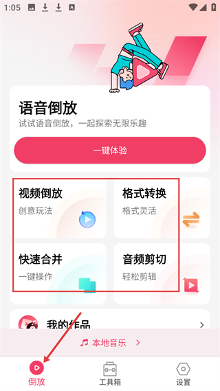 1、倒放功能板塊,有語音倒放、視頻倒放等功能,語音倒放可一鍵體驗,滿足音視頻創意編輯需求。