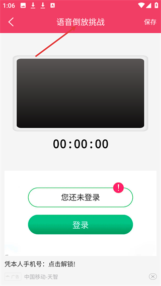 2、語音倒放挑戰功能,需登錄使用,界面有時間顯示區域,可進行挑戰并保存作品,提供趣味語音倒放互動體驗。