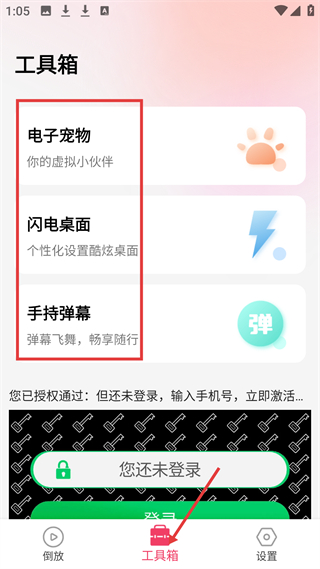 3、工具箱板塊,有電子寵物、閃電桌面、手持彈幕功能,閃電桌面可設酷炫桌面,手持彈幕支持彈幕飛舞,豐富體驗。