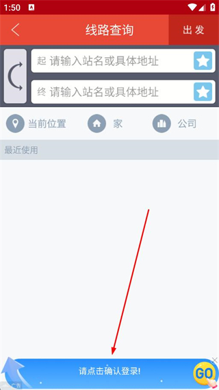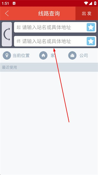 3、登錄后在線路查詢頁面輸入起點站名或具體地址、終點站名或具體地址,也可選擇當前位置、家、公司作為起點或終點,準備查詢線路。