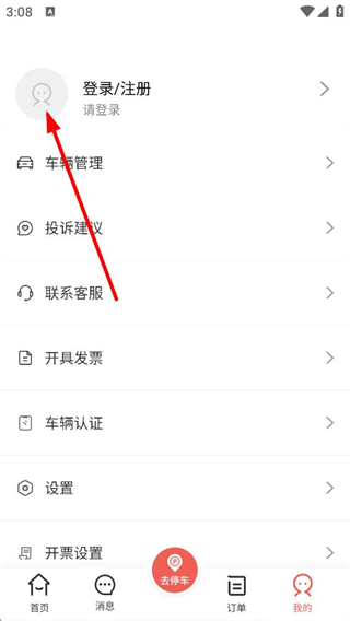 2、進入我的界面,可找到登錄、注冊入口,還有車輛管理投訴建議聯系客服等功能選項,這些選項可對應進行相關操作。