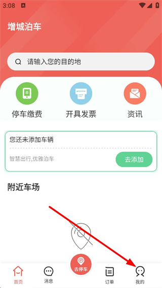 1、進入增城泊車首頁,可搜索框輸入目的地,使用停車繳費開具發票資訊等功能,還能添加車輛,點擊底部我的進入個人相關界面。