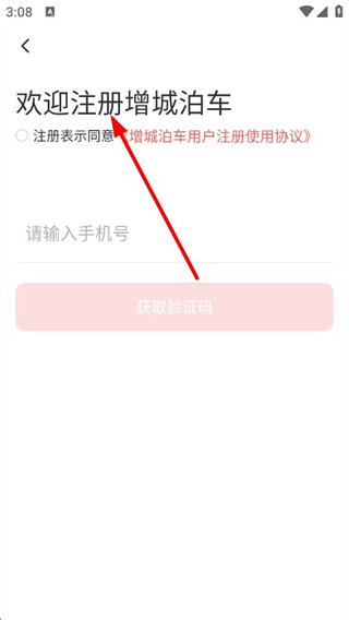 4、進入注冊界面,需先勾選同意用戶注冊使用協議,再輸入手機號,之后點擊獲取驗證碼,即可繼續完成賬號注冊流程。
