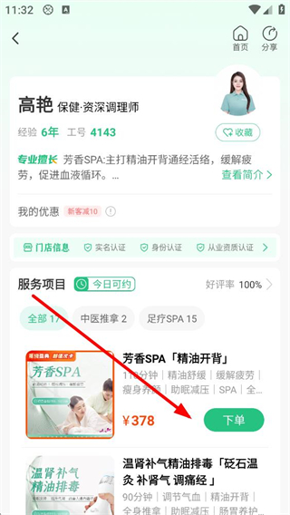 3、進入調理師詳情頁,可查看調理師專業擅長、服務項目等信息,如高艷調理師的芳香SPA精油開背項目,點擊下單按鈕可進行服務預約。