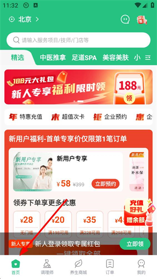 1、進入首頁可看到搜索框、各類服務分類如中醫推拿、足道SPA等,還有新人專享福利、新用戶優惠項目及領券下單板塊。
