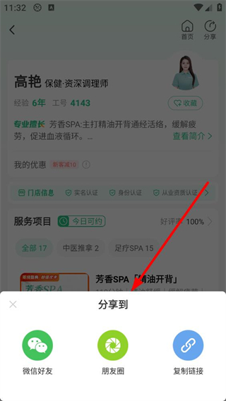 4、調理師詳情頁可點擊分享,選擇分享到微信好友、朋友圈或復制鏈接,方便將調理師及服務項目分享給他人。