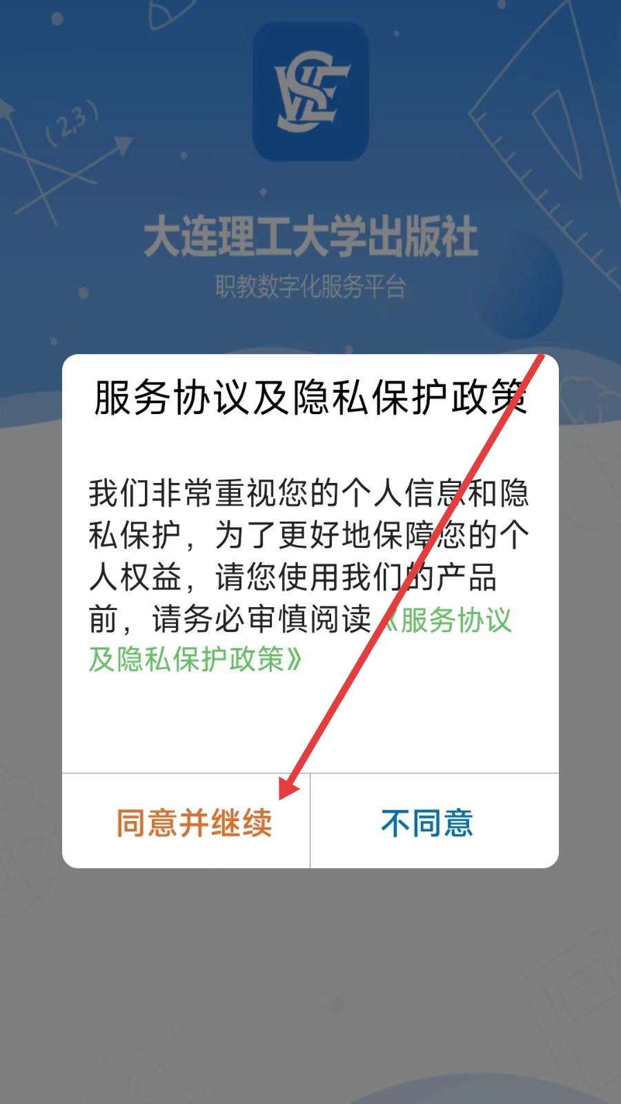 1、啟動后彈出服務協議及隱私保護政策提示,閱讀內容后點擊同意并繼續,即可進入大連理工大學出版社職教數字化服務平臺,開啟后續教學資源使用流程。