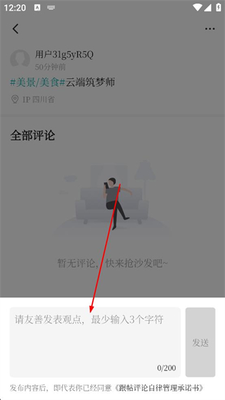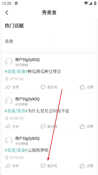 3、在秀美食頁面找到感興趣的用戶動態,點擊該動態下方的搶沙發按鈕,進入評論界面,準備發布自己對這條動態的看法。