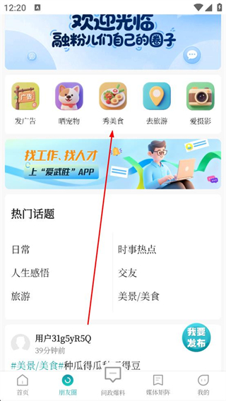 2、登錄成功后進入首頁瀏覽各類功能入口,選擇秀美食選項,點擊進入對應的內容頁面,查看其他用戶分享的美食相關動態和話題。