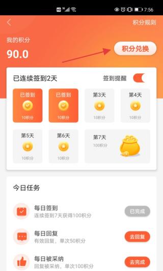 1、點擊積分頁面顯示90積分,有連續簽到記錄與今日任務,像每日簽到等,可點擊積分兌換。