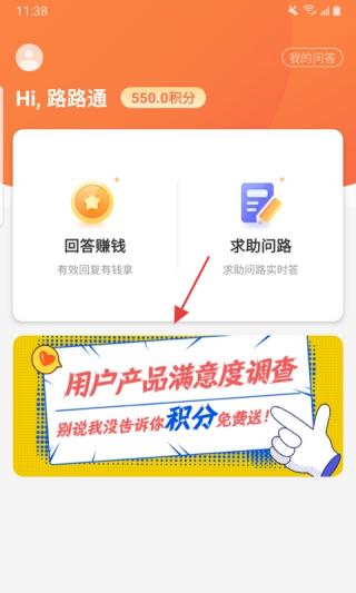 2、點擊用戶路路通有550積分,有回答賺錢等功能,下方是用戶產品滿意度調查入口。
