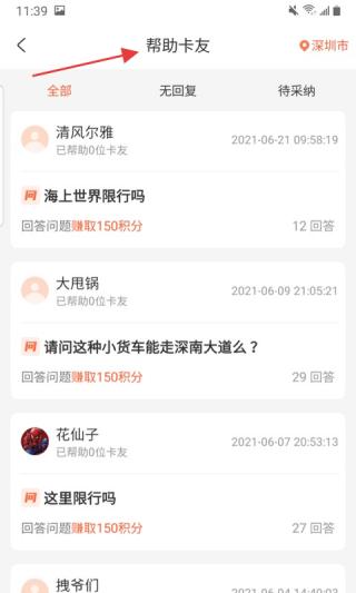 3、點擊幫助卡友頁面展示各地卡友問題,回答可獲150積分,如海上世界限行嗎等問題待解。