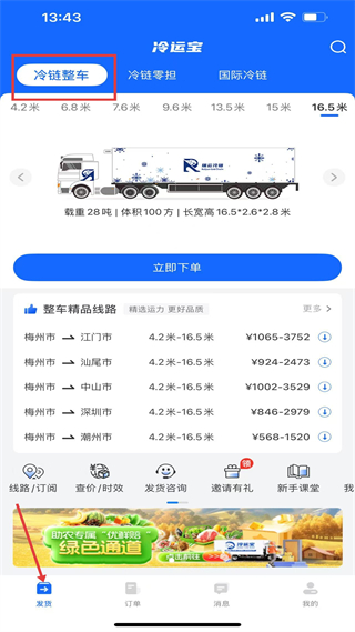 1、冷鏈整車板塊,屬于冷運寶APP,展示冷鏈整車信息,有梅州至多地線路,標注價格區間,提供下單入口,還有助農活動。