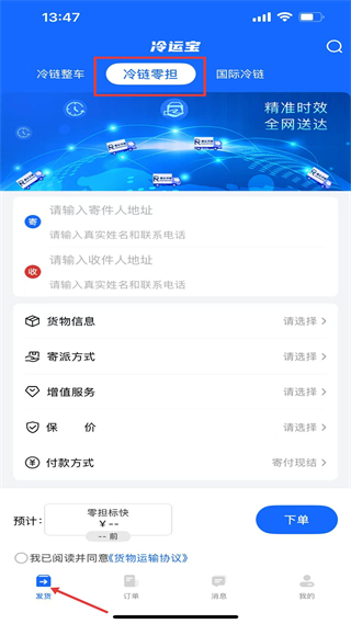 2、冷鏈零擔板塊,需填寫寄收件地址等,可選擇多種服務,支持保價與付款方式,提供下單入口,需同意運輸協議。