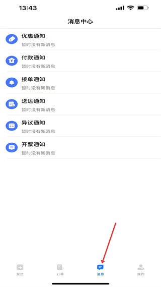 3、消息板塊,即消息中心,有優惠通知、付款通知等多種消息分類,實時推送物流相關通知,目前各分類暫無新消息。