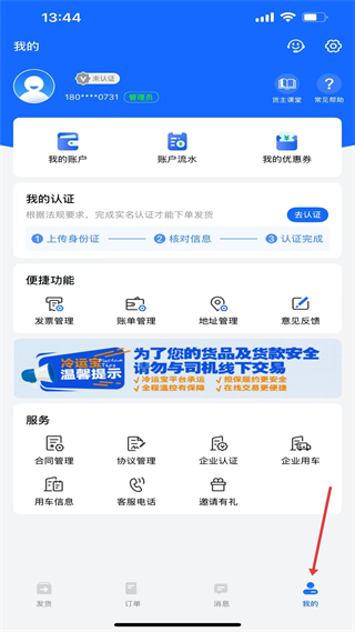 4、我的板塊,提供賬戶管理等功能,有多種便捷功能與服務入口,需完成實名認證才能下單發貨。