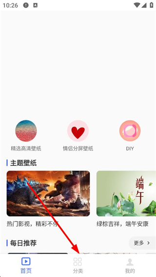 1、進入應用首頁,能看到精選高清壁紙等功能入口,還有主題壁紙、每日推薦板塊,點擊底部分類按鈕可進入分類界面。
