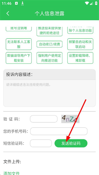 4、個人信息泄露投訴的詳細界面,可描述投訴內容,輸入驗證碼、手機號碼,獲取并填寫短信驗證碼,還可上傳相關文件,完成投訴流程。